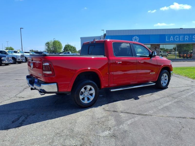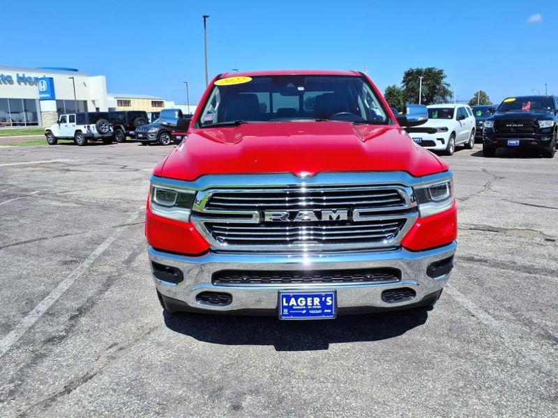 Lager's of Mankato is proud to present this 2022 Ram 1500 Laramie Laramie Level I Equipment Group (2nd Row In Floor Storage Bins, Auto High Beam Headlamp Control, Blind Spot & Cross Path Detection, Foam Bottle Insert (Door Trim Panel), ParkSense Front/Rear Park Assist w/Stop, Rain Sensitive Windshield Wipers, and Remote Tailgate Release), Quick Order Package 27H Laramie, #1 Seat Foam Cushion, 10 Speakers, 12'' Touchscreen Display, 3 Rear Seat Head Restraints, 3.21 Rear Axle Ratio, 4 Way Front Headrests, 4-Wheel Disc Brakes, 48V Belt Starter Generator, 4G LTE Wi-Fi Hot Spot, 8.4'' Touchscreen, ABS brakes, Adjustable pedals, Air Conditioning, All R1 High Radios, All Radio Equipped Vehicles, Alloy wheels, AM/FM/SiriusXM radio:, Anti-Spin Differential Rear Axle, Apple CarPlay, Apple CarPlay/Android Auto, Audio memory, Auto-dimming door mirrors, Auto-Dimming Exterior Driver Mirror, Auto-dimming Rear-View mirror, Automatic temperature control, Brake assist, Bumpers: chrome, Chrome Exterior Mirrors, Compass, Connected Travel & Traffic Services, Connectivity - US/Canada, Convex Wide-Angle Mirror Insert, Delay-off headlights, Disassociated Touchscreen Display, Driver door bin, Driver Seat Memory, Driver vanity mirror, Dual front impact airbags, Dual front side impact airbags, Electronic Stability Control, Exterior Mirrors Courtesy Lamps, Exterior Mirrors w/Heating Element, Exterior Mirrors w/Memory, Exterior Mirrors w/Supplemental Signals, For Details, Visit DriveUconnect.com, For More Info, Call 800-643-2112, Front anti-roll bar, Front Center Armrest w/Storage, Front dual zone A/C, Front fog lights, Front License Plate Bracket, Front reading lights, Front Seat Back Map Pockets, Front wheel independent suspension, Fully automatic headlights, Garage door transmitter, Global Telematics Box Module (TBM), Google Android Auto, GPS Antenna Input, GPS Navigation, HD Radio, Heated door mirrors, Heated Front Seats, Heated front seats, Heated Steering Wheel, Heated steering wheel, Heavy-Duty Engine Cooling, Illuminated entry, Integrated Center Stack Radio, Integrated Voice Command w/Bluetooth, Leather steering wheel, Leather Trim 40/20/40 Bench Seat, Low tire pressure warning, Manufacturer's Statement of Origin, Memory seat, Occupant sensing airbag, Outside temperature display, Overhead airbag, Overhead console, Panic alarm, ParkView Rear Back-Up Camera, Passenger door bin, Passenger vanity mirror, Pedal memory, Power 2-Way Driver Lumbar Adjust, Power 2-Way Passenger Lumbar Adjust, Power 8-Way Driver & Passenger Seats, Power door mirrors, Power driver seat, Power passenger seat, Power steering, Power windows, Power-Folding Mirrors, Radio data system, Radio: Uconnect 5 Nav w/12.0'' Display, Radio: Uconnect 5 W w/8.4'' Display, Rear 60/40 Folding Seat, Rear anti-roll bar, Rear seat center armrest, Rear step bumper, Rear Wheelhouse Liners, Rear window defroster, Remote keyless entry, Security system, SiriusXM Radio Service, SiriusXM w/360L, Speed control, Split folding rear seat, Steering wheel mounted audio controls, Tachometer, Telescoping steering wheel, Tilt steering wheel, Traction control, Trailer Brake Control, Trip computer, Turn signal indicator mirrors, USB Host Flip, Variably intermittent wipers, Ventilated Front Seats, Ventilated front seats, Voltmeter, and Wheels: 18'' x 8'' Aluminum Base PainteD. Odometer is 8108 miles below market average! Priced below KBB Fair Purchase Price!